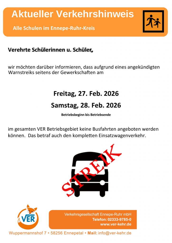 Die VER informiert darüber, dass es am Freitag, 27.02.2026 aufgrund eines angekündigten Warnstreiks zu erheblichen Einschränkungen im gesamten Verkehrsgebiet kommt. Der reguläre Fahrbetrieb einschließlich des Schülerverkehrs entfällt an diesem Tag.